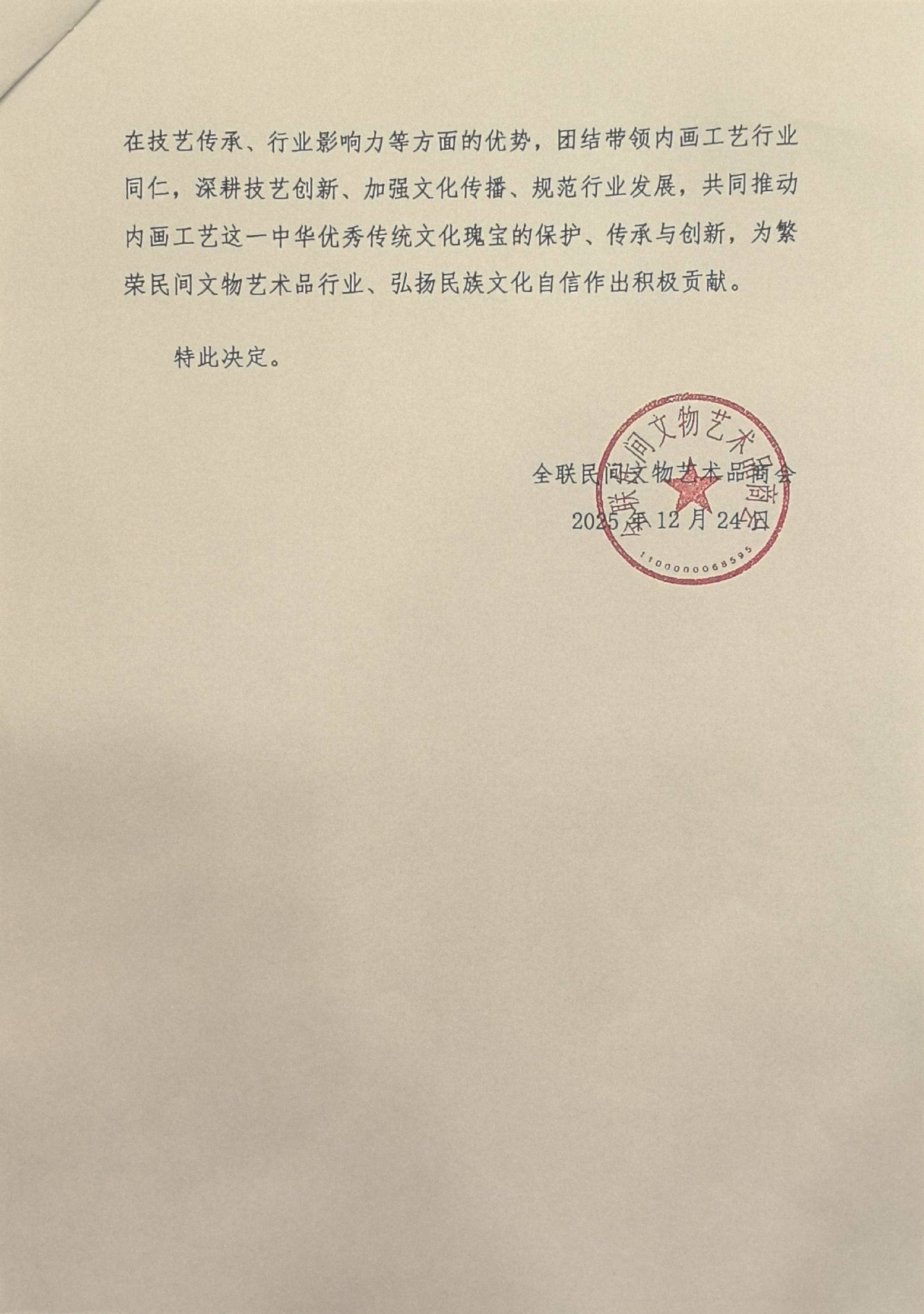 U8.COM·(中国区)有限公司官网岁末迎新,文脉赓续。2025年12月24日,全联民间文物艺术品商会内画工艺专业委员会在“传承千年文脉·点亮岁末华章”北京亮马中国传统文化艺术节上正式成立,这标志着中国内画工艺行业迎来“抱团发展”的里程碑时刻。经全联民间文物艺术品商会常务会长会协商研究并报全国工商联组织建设部同意,河北省内画大师、一级工艺美术大师张增楼当选为专委会首任会长,开启内画艺术保护、传承与创新的新篇章。