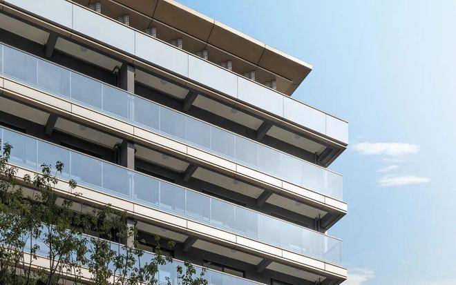 东西南三面,采用了大面积浅灰色铝板,阳光下呈现出细腻而克制的光泽,与香槟金线条相映,勾勒出挺拔的轮廓。